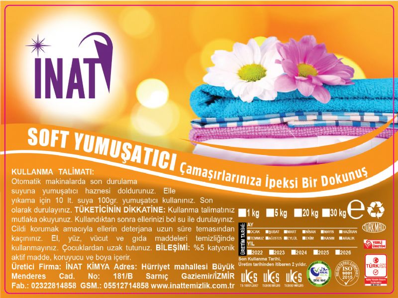 KULLANMA TALİMATI: Otomatik makinalarda son durulama suyuna yumuşatıcı haznesi doldurunuz. Elle yıkama için 10 It. suya 100gr. yumuşatıcı kullanınız. Son olarak durulayınız. TÜKETİCİNİN DİKKATİNE: Kullanma talimatınız mutlaka okuyunuz. Kullandıktan sonra ellerinizi bol su ile durulayınız. Cildi korumak amacıyla ellerin deterjana uzun süre temasından kaçınınız. El, yüz, vücut ve gıda maddeleri temizliğinde kullanmayınız. Çocuklardan uzak tutunuz. BİLEŞİMİ: %5 katyonik aktif madde, koruyucu ve boya içerir. Üretici Firma: İNAT KIMYA Adres: Hürriyet mahallesi Büyük Menderes Cad. No: 181/B Sarnıç Gaziemir/İZMİR Fab.: 02322814858 GSM.: 05512714858 www.inattemizlik.com.tr