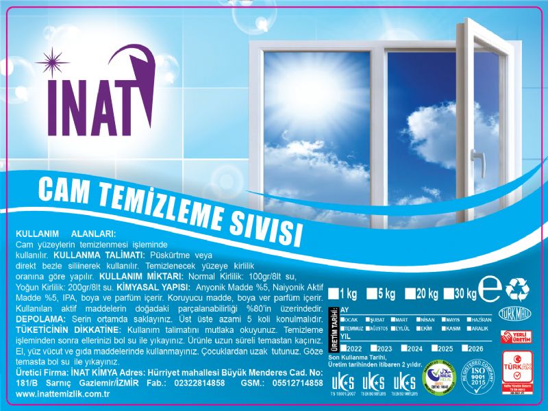USAGE AREAS: It is used for cleaning glass surfaces. INSTRUCTIONS FOR USE: It is used by spraying or by wiping directly with a cloth. It is done according to the pollution rate on the surface to be cleaned. USAGE AMOUNT: Normal Pollution: 100gr/8it water, Heavy Pollution: 200gr/8it water. CHEMICAL COMPOSITION: Contains 5% Anionic Substance, 5% Naionic Active Substance, IPA, dye and perfume. Contains preservatives, dyes and perfumes. The degradability of the active substances used in nature is over 80%. STORAGE: Store in a cool environment. Maximum 5 boxes should be placed on top of each other. Do not use on hands, face, body and foodstuffs. Keep away from children. ATTENTION TO THE CONSUMER: Be sure to read the instructions for use. After cleaning, wash your hands with plenty of water. Avoid prolonged contact with the product. In case of contact with eyes, rinse with plenty of water. Manufacturer Company: İNAT KİMYA Address: Hürriyet Mahallesi Büyük Menderes Cad. No: 181/B Sarnic Gaziemir/İZMİR Factory: 02322814858 GSM: 05512714858 www.inettemizlik.com.tr