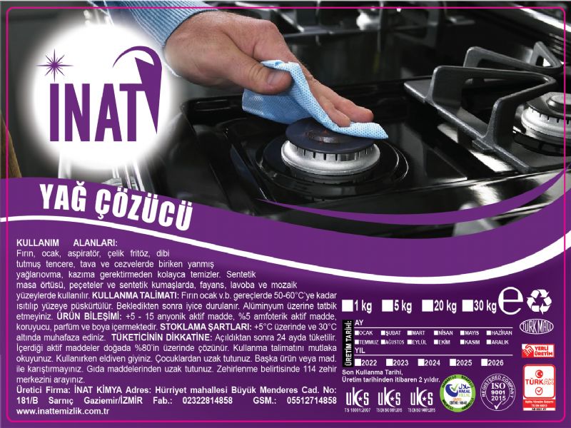 KULLANIM ALANLARI: Fırın, ocak, aspiratör, çelik fritöz, dibi tutmuş tencere, tava ve cezvelerde biriken yanmışyağlari ovma, kazıma gerektirmeden kolayca temizler. Sentetik masa örtüsü, peçeteler ve sentetik kumaşlarda, fayans, lavoba ve mozaik yüzeylerde kullanılır. KULLANMA TALİMATI: Fırın ocak v.b. gereçlerde 50-60°C'ye kadar Isıtılıp yüzeye püskürtülür. Bekledikten sonra iyice durulanır. Alüminyum üzerine tatbik etmeyiniz ÜRÜN BİLEŞİMİ: +5 15 anyonik aktif madde, %5 amfoterik aktif madde, koruyucu, parfüm ve boya içermektedir. STOKLAMA ŞARTLARI: +5°C üzerinde ve 30°C altında muhafaza ediniz. TÜKETİCİNİN DİKKATİNE: Açıldıktan sonra 24 ayda tüketilir. İçerdigi aktif maddeler doğada %80'in üzerinde çözünür. Kullanma talimatını mutlaka okuyunuz. Kullanırken eldiven giyiniz. Çocuklardan uzak tutunuz. Başka ürün veya mad. ile karıştırmayınız. Gıda maddelerinden uzak tutunuz. Zehirlenme belirtisinde 114 zehir merkezini arayınız. Üretici Firma: INAT KIMYA Adres: Hürriyet mahallesi Büyük Menderes Cad. No:181/B Sarnıç Gaziemir/İZMİR Fab.: 02322814858 GSM: 05512714858 www.inattemizlik.com.tr
