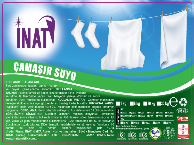 USAGE AREAS: It is used on hard floors, toilets, bathrooms, kitchens and white laundry. INSTRUCTIONS FOR USE: In general cleaning, some amount is taken into the container, cleaning is done by rubbing and wiping. WC is poured on the surface in the bathroom and then rinsed, not used in warning colors. AMOUNT OF USE: After taking detergent into the washing machine, one glass of water is emptied from the same compartment. CHEMICAL COMPOSITION: Contains hypochlorite. Active substance -30%, The active substances used are completely decomposed in nature. STORAGE: Store in a cool environment. Maximum 5 boxes should be placed on top of each other. ATTENTION TO THE CONSUMER: Be sure to read the instructions for use. After cleaning, wash your hands with plenty of water. Avoid prolonged contact with the product. Hand. Do not use on face, body and foodstuffs. In case of eye contact, rinse with plenty of water. Keep away from children. Do not mix with other cleaning agents. If swallowed, drink 1-2 glasses of water and consult a doctor immediately pH: 12-14 Manufacturer Company: INAT KIMYA Address: Hürriyet Mahallesi Büyük Menderes Cad. No: 181/B Sarnıç Gaziemir/IZMIR Factory: 02322814858 GSM: 05512714858 www.inettemizlik.com.tr